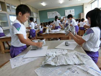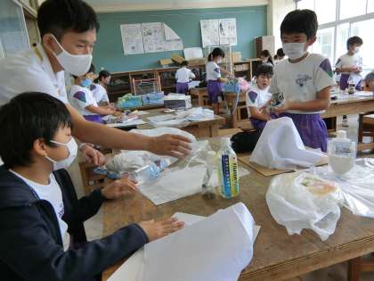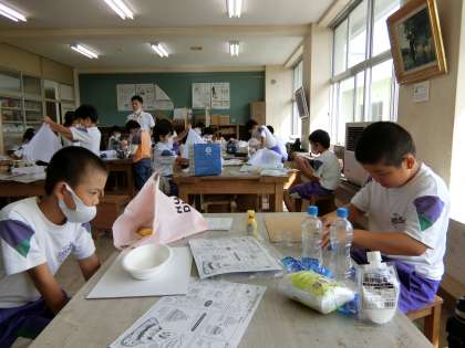 図工室の4年生。液体粘土と不織布等で立体作品をつくる学習に取りかかりました。