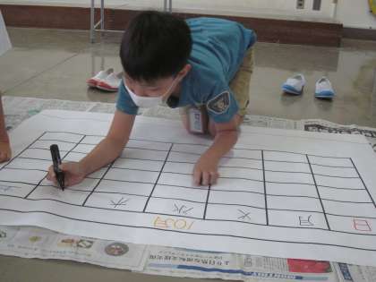10月の予定を協力して書きました。季節のイラストも描き入れ、楽しい予定表にしています。