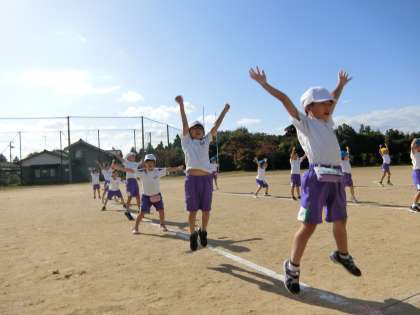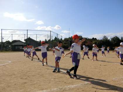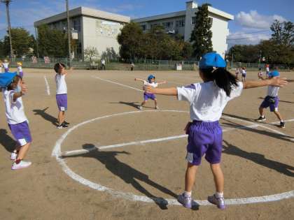 グラウンドで、海の中の世界を表現する1年生。