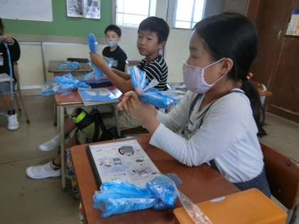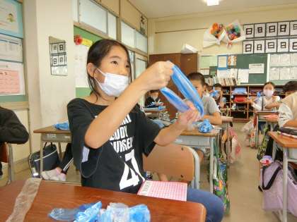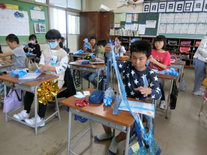 3年生は、学習発表会で使うポンポンを自作していました。
