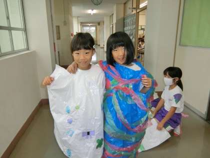 制作した衣装を試着する2年生。ごきげんです。