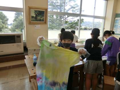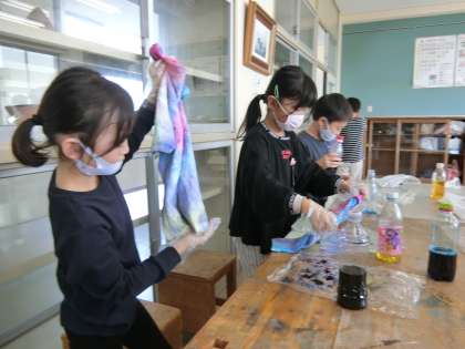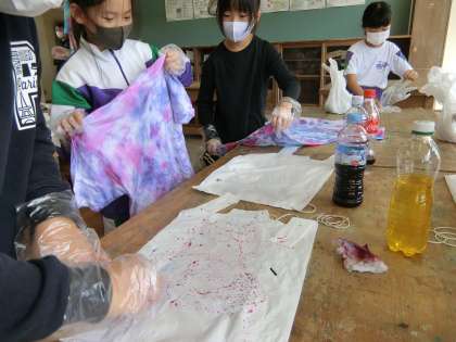 3年生の図画工作科の学習。染料で、オリジナルTシャツづくりを楽しんでいます。