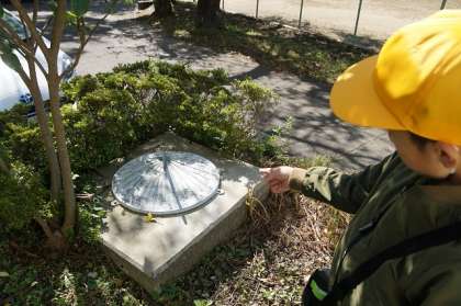 太陽の反対側にかげができることを学習しました。外に出かけ前庭にあった日時計のかげと太陽の位置を確認しました。
