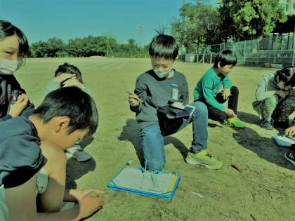 快晴。3年生は、用意した観察セットでかげの動きを調べました。