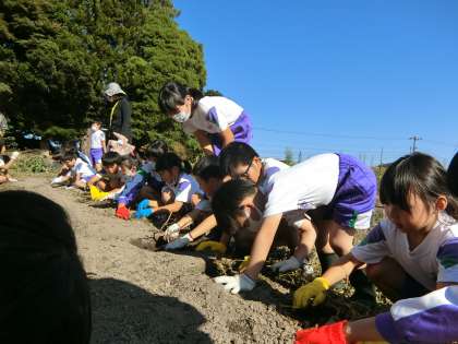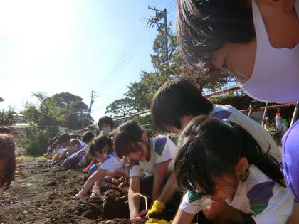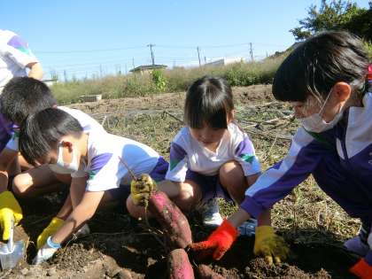 絶好のいもほり日和。6年生が1年生のいもほりをサポート。