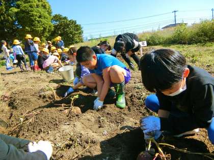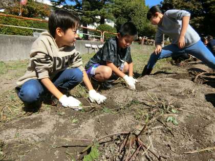 6月に5年生が苗を植えたサツマイモ。カボチャのように大きくなりました。