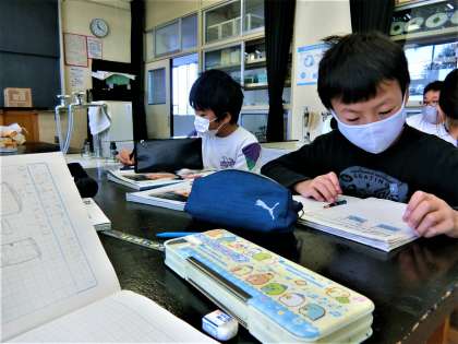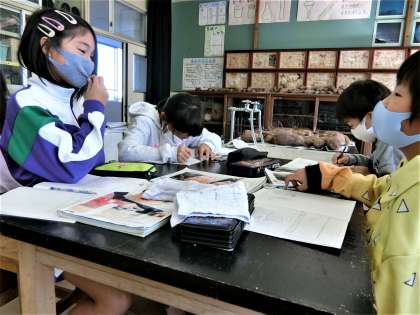 ビーカーの中の水が少なくなったことに注目して、その理由を考えているところ。