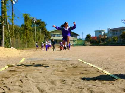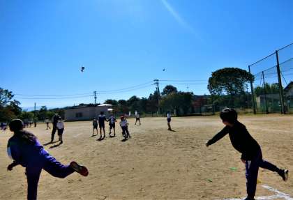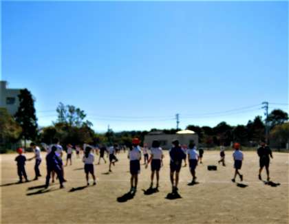 業間(太陽の時間)の全校体力つくり活動。青空の下、のびのびと運動に親しみました。