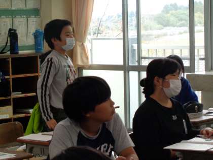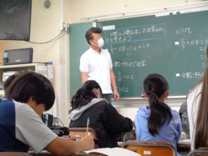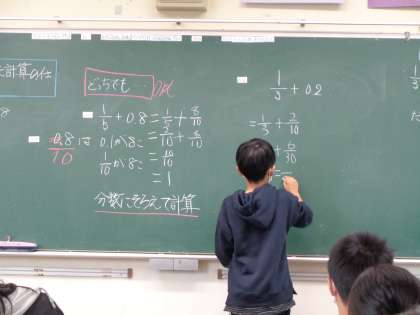 5年生の算数科の学習。分数と小数の入り混じった計算の仕方を学んでいます。