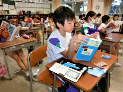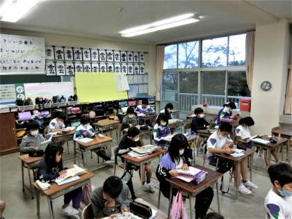 読書タイム。3・4年生教室には、読みふける子供たちの姿がみられました。