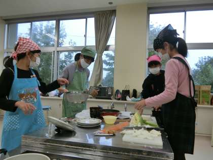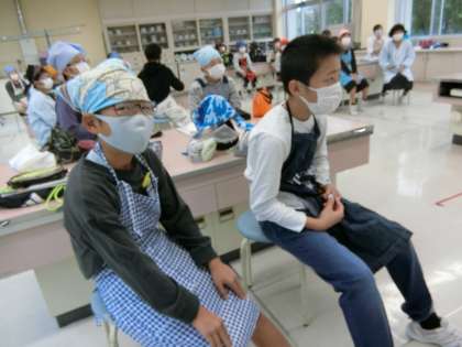 家庭科室の6年生。身支度を調え、調理実習開始です。