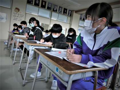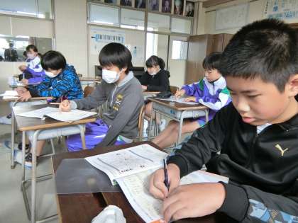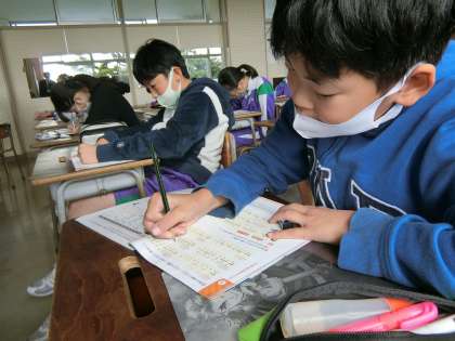 音楽室で学ぶ5年生。楽譜に書き込みをしています。