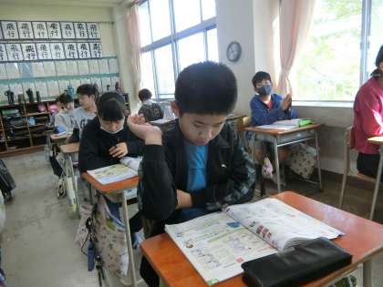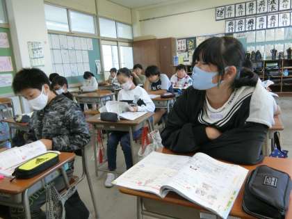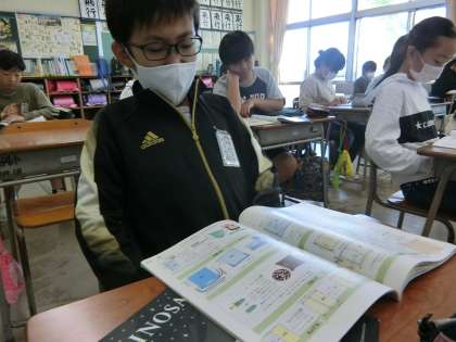 5年生の家庭科の時間。ナップザックづくりの手順を学習しています。