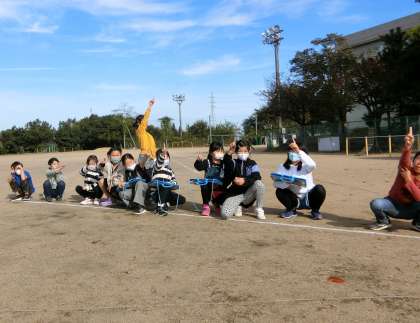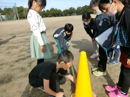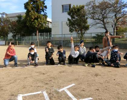 グラウンドで、東→南→西という太陽の見かけの動きを指で表す3年生。