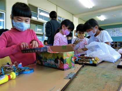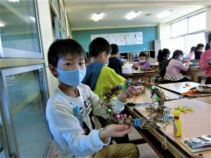 大切に育てたアサガオの蔓でリースを作る1年生。