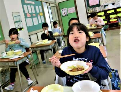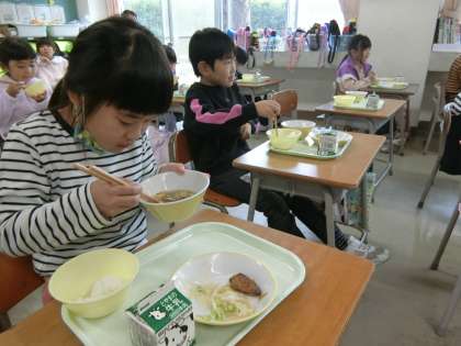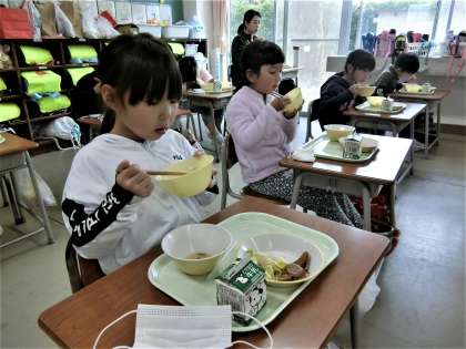 給食の時間。今日は、「フクラギの甘味噌かけときのこ汁が美味しい。」とのことでした。