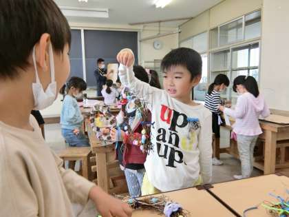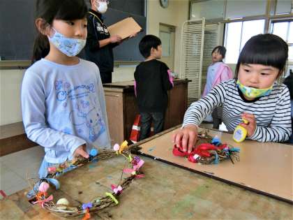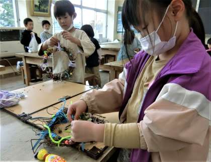 図工室で、あさがおのリースづくりの続きをする1年生。