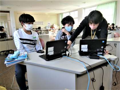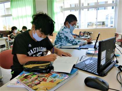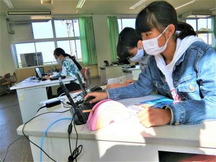 パソコンで織田信長や豊臣秀吉について調べる6年生。