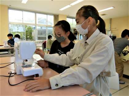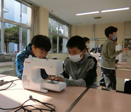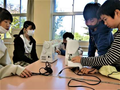 バック作りが始まりました。家庭科室で、ミシンの使い方を学ぶ5年生。