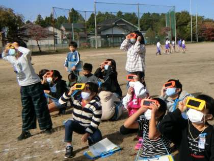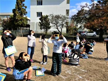 遮光プレートで太陽を観察する3年生。太陽は思ったよりも小さかったのだそうです。