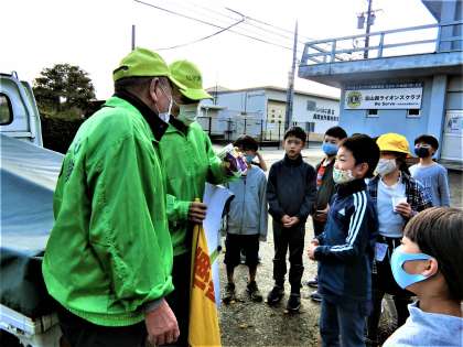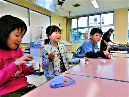 農園を耕してくださった見守り隊の隊長さんに、できたてのサツマイモ料理を贈る2年生。その後、自分たちも実食しました。