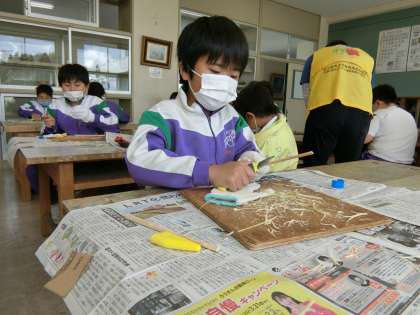 自然の家の先生から小刀の使い方を学び、竹を削って箸を作る4年生。