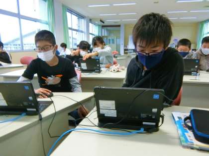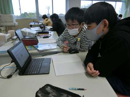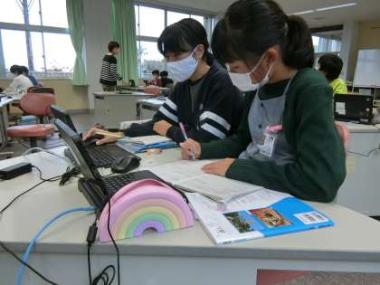 コンピュータ室の6年生。引き続き、織田信長と豊臣秀吉について調べています。