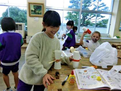 木の実や紙コップなど、集めた材料で遊ぶ物を作る1年生。