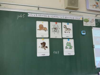 今日は、動物とその食べ物について英語で話す学習をしています。
