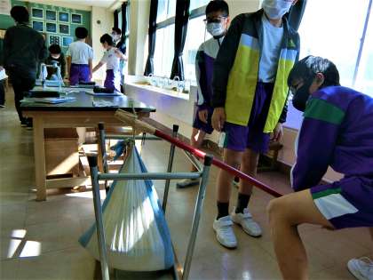 棒の置き方や砂袋を吊す位置、持つ位置によって、手応えが変わることを体験的に学んでいます。