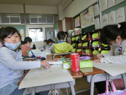 箱の形を写し取る1年生。輪になって、互いのつぶやきや疑問などを聞き合えるようにしています。