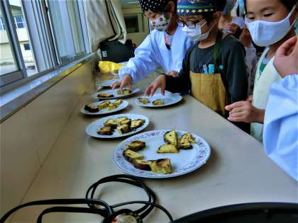 6年生が、1年生をおやつ作りに招待してくれました。手始めに、ホットプレートで焼いた焼き芋をつまみました。ただ焼いただけなのに、「おいしい。」と好評でした。