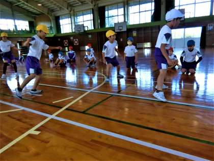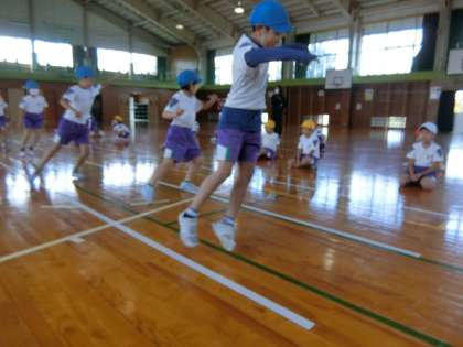 体育館で、反復横跳びの記録をとる2年生。
