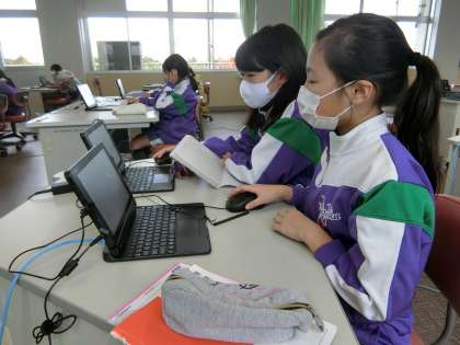 コンピュータ室の4年生。インターネットで伝統工業について調べているようです。