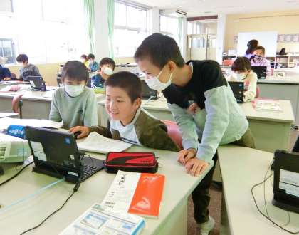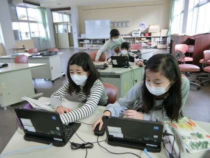コンピュータ室の4年生。パソコンで調べることに随分慣れてきました。