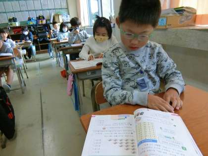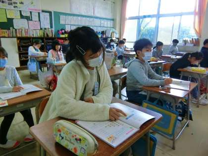 教科書を見ながら、「ごいちがご」「ごにじゅう」「ごさんじゅうご」と初々しく九九を口ずさむ2年生。
