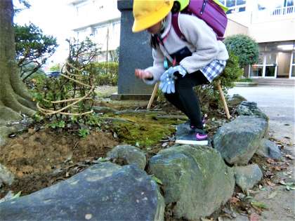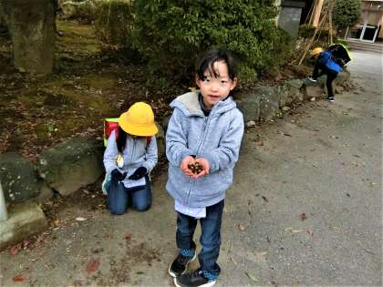 登校したばかりの1年生。学校の前庭で、どんぐり拾いを楽しんでいます。