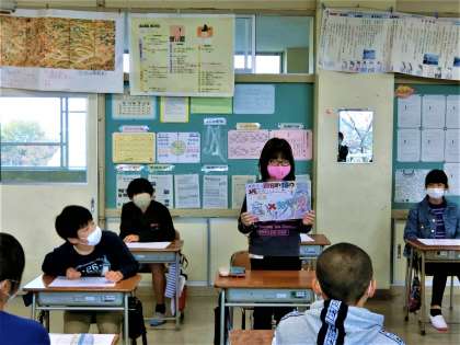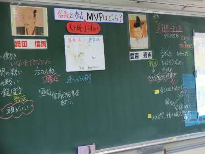 織田信長と豊臣秀吉。天下統一への貢献度について調べたことを基に話し合う6年生。