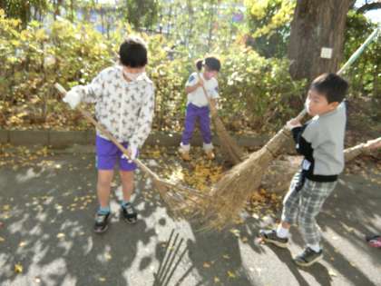 1年生の落ち葉掃き。背丈より長い竹箒を上手に使っています。