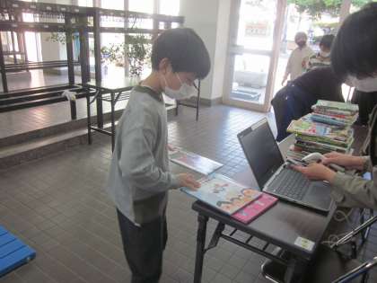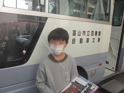 自動車文庫の様子。好きな本を選び、自動車の前でにこやかな顔で立ち止まりました。