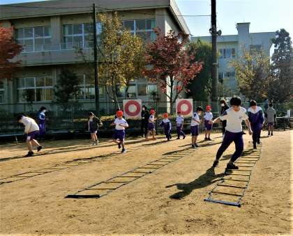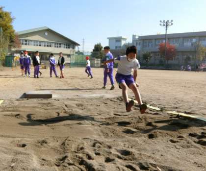 青空の下、全校児童がグラウンドで運動に親しみました。