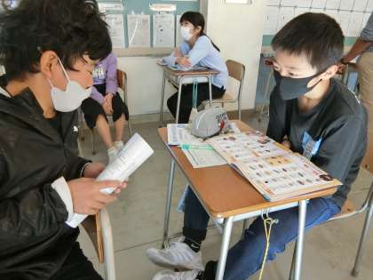 今日は、英語専科教員とALTの来校日。今朝の朝食について、英語で紹介し合う6年生。