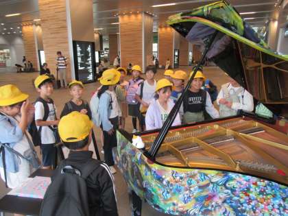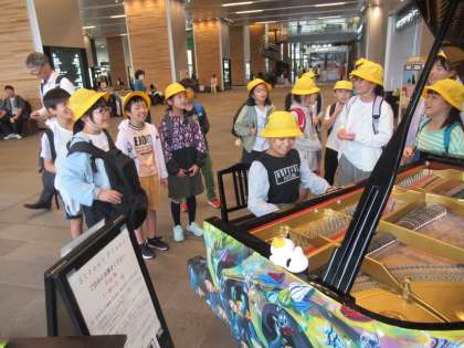 富山駅で市内電車を待っている間の様子です。駅構内のストリートピアノで合唱を披露しました。