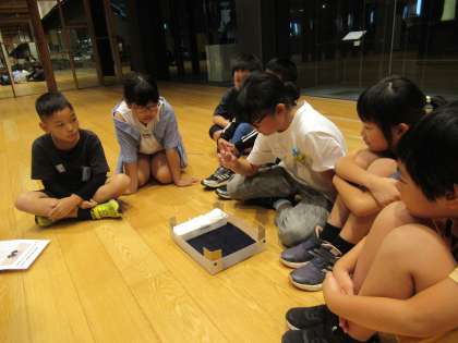 子供たちは、ガラス作品を見て、「砂糖に見える」、「ガラスとプラスチックが混ざった作品かな」など感じたことを自由に話しながら、鑑賞しました。