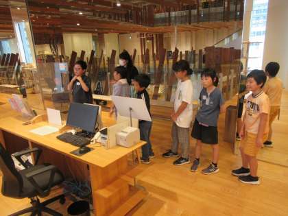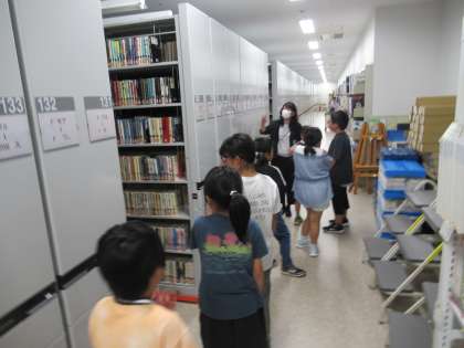 図書館では、大量の本が所蔵されている場所を見学しました。本の匂い喜ぶ子供、あまり好きではないと話す子供など、様々な反応をしていました。