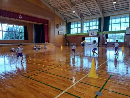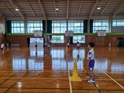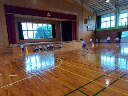 ボールを受けたり蹴ったりする練習に加え、走者をアウトにする工夫も相談しています。