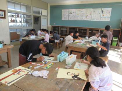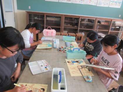 宿泊学習で一番心に残った瞬間を、絵に表しています。一番伝えたいことが伝わるように表現の仕方を工夫しています。
