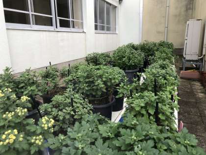 子どもたちが大切にお世話をしている菊につぼみがついてきました。