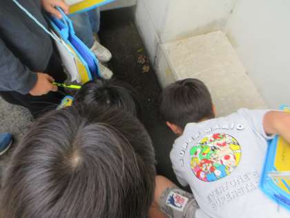 国語科の学習で「あきのことばをさがそう」という単元があります。そこで、子供たちと校舎の周りをぐるりとまわりました。