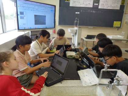 「常願寺川は急流、降水量が多いから、流れる水のはたらきが大きいというみんなの予想、本当?」という問題を解決するために、実験に取り組んでいる子供たちです。友達と意見交換しながら、学びを深めています。